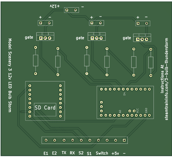 The SD card is loaded with the recommended sounds for this project. If you wish to use different thunder sounds, this page shows how to load them on the card . You can get other sounds here. Player Sounds