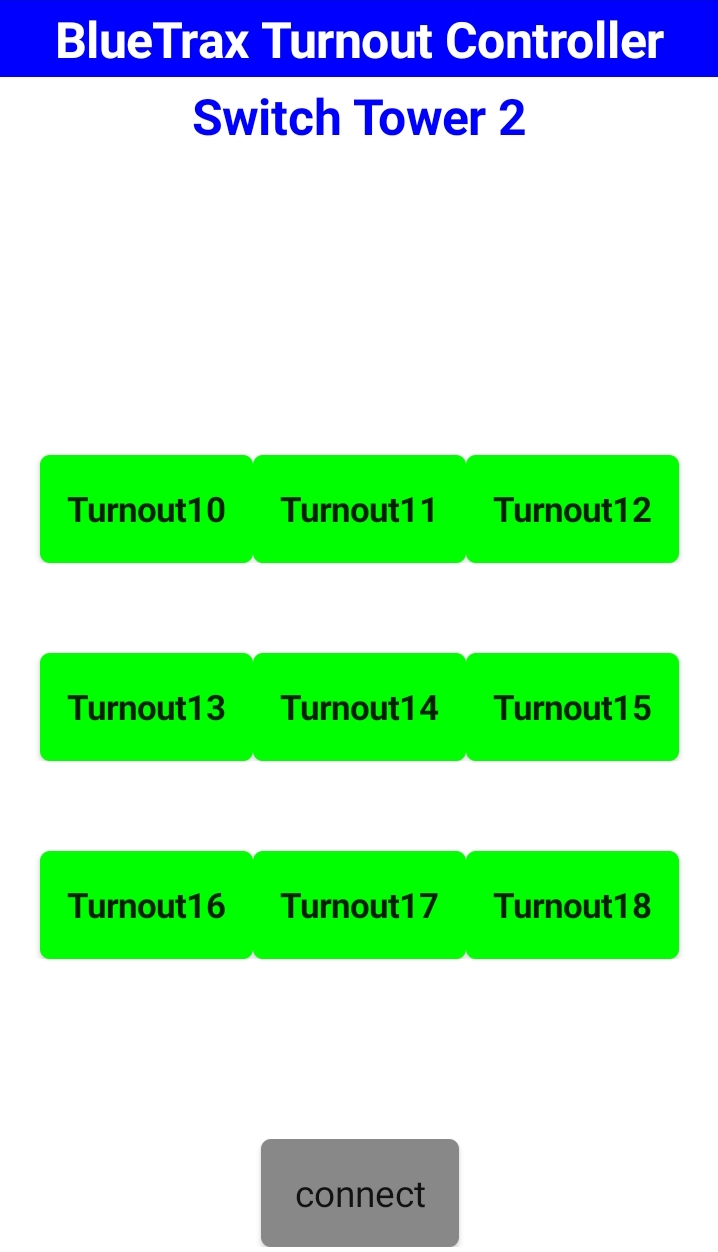 Turnout Tower 2 – This is a companion to Turnout Tower1. It has the same characteristics but for having buttons labeled 10 through 18. The app is free. The control board comes programmed and ready to use.