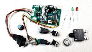A motor controller that has connected to it a switch for reversing motor direction and a potentiometer that is used to control motor speed,