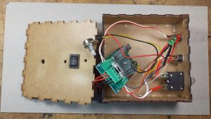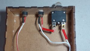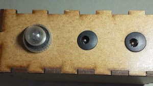 Insert the potentiometer control pin through a hole in the top. Do the same with the LEDs and switch.