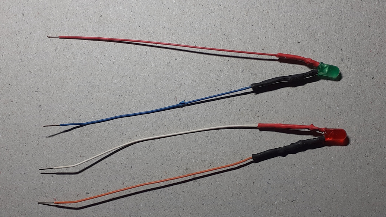 Add wires to LEDs. Include a resistor on one leg. Add the red and black shrink tube on the appropriate leg.